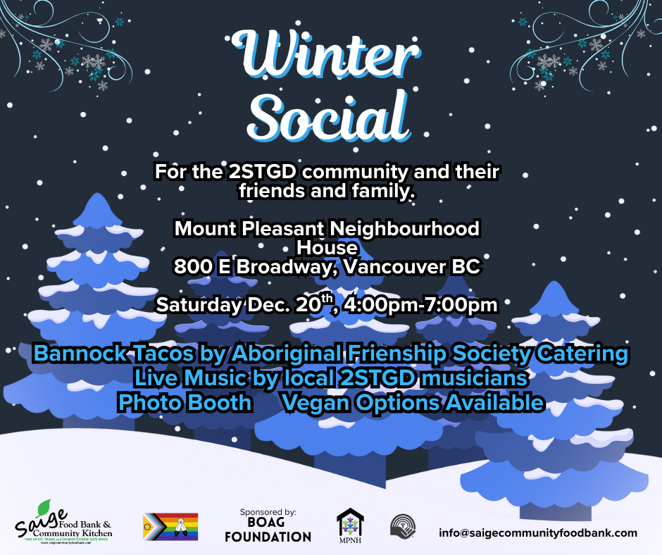 Sponsored by the Boag Foundation and partnering with Mount Pleasant Neighbourhood House through our Community Kitchen project, we are creating a Winter Social to celebrate and bring together those in our community. This event is to bring Two-Spirit, Trans and Gender Diverse folks together to socialize and celebrate.