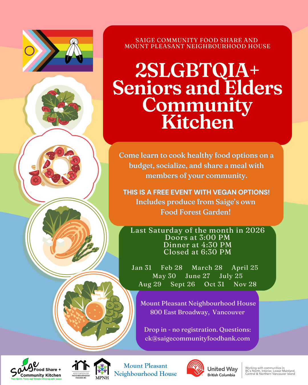This community kitchen is a drop-in event geared towards the 2STGD Seniors and Elders partnering with Mount Pleasant Neighbourhood House. Participants are welcomed to bring a friend, partner or ally. Please bring take home containers and a bag as we always have extra food and produce to take home.